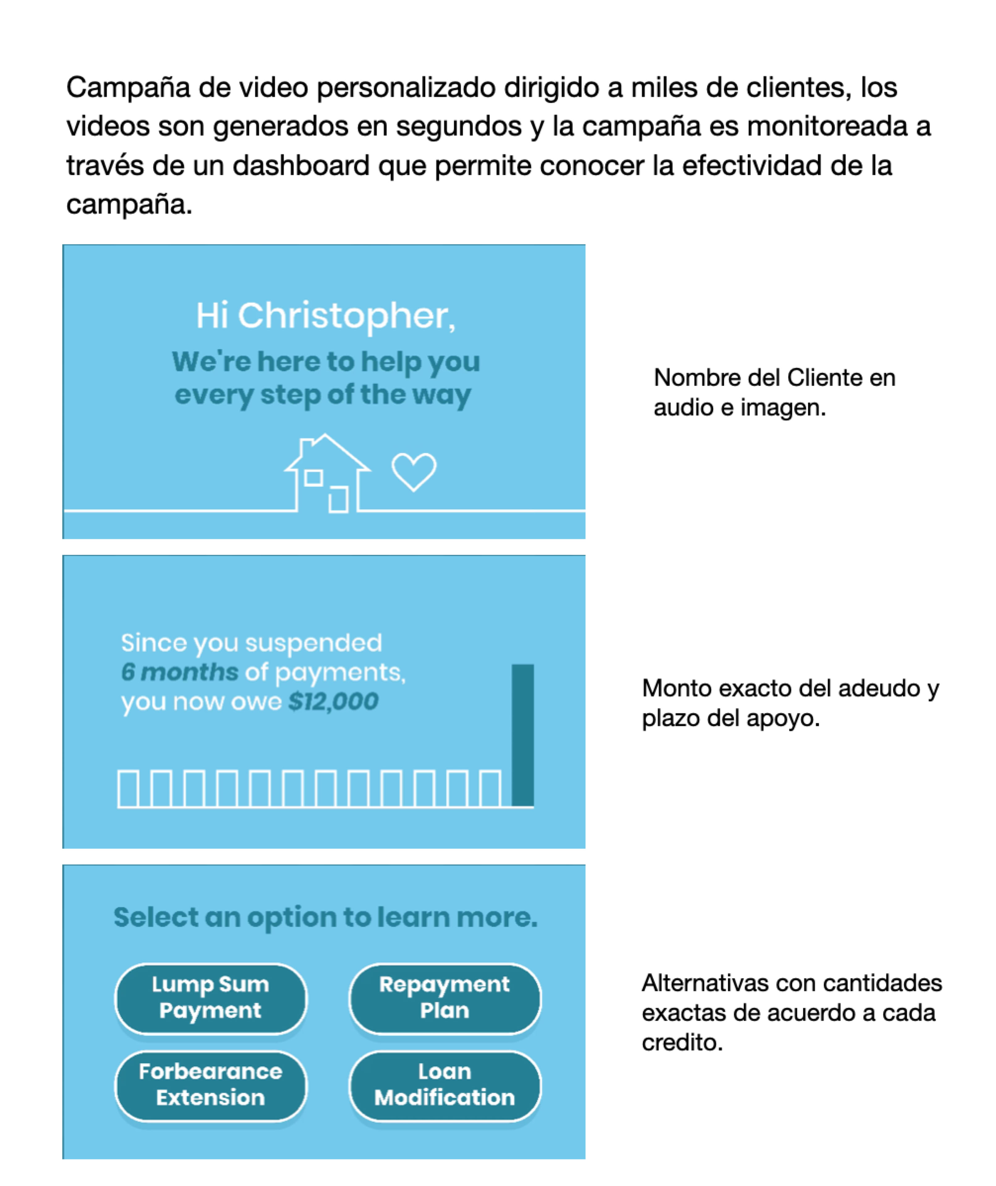 El video personalizado es una solución efectiva y fácil de implementar. Permite presentar con claridad a los acreditados las diferentes alternativas de pago de una manera amigable y tranquilizadora, reduciendo el estrés para sus clientes sin saturar las líneas telefónicas.