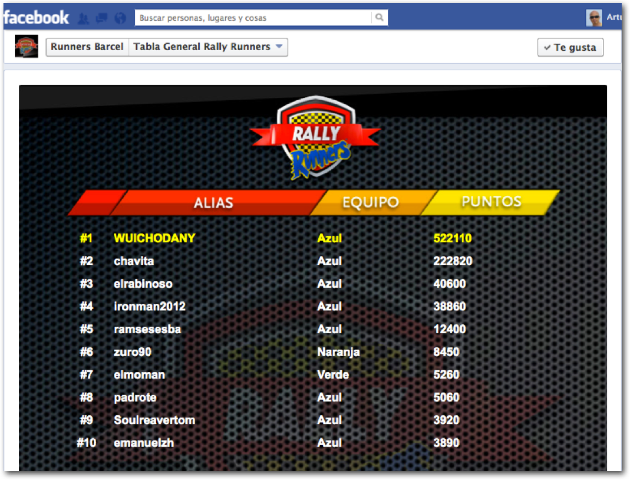 El sistema envía de manera automática, información a un “page Tab” dentro del fanpage de “Runners” que permite conocer a los diez jugadores con mayor puntuación (scoreboard), los primeros lugares de cada uno de los 20 seriales (Podium de ganadores) y una sección de tips &tricks.