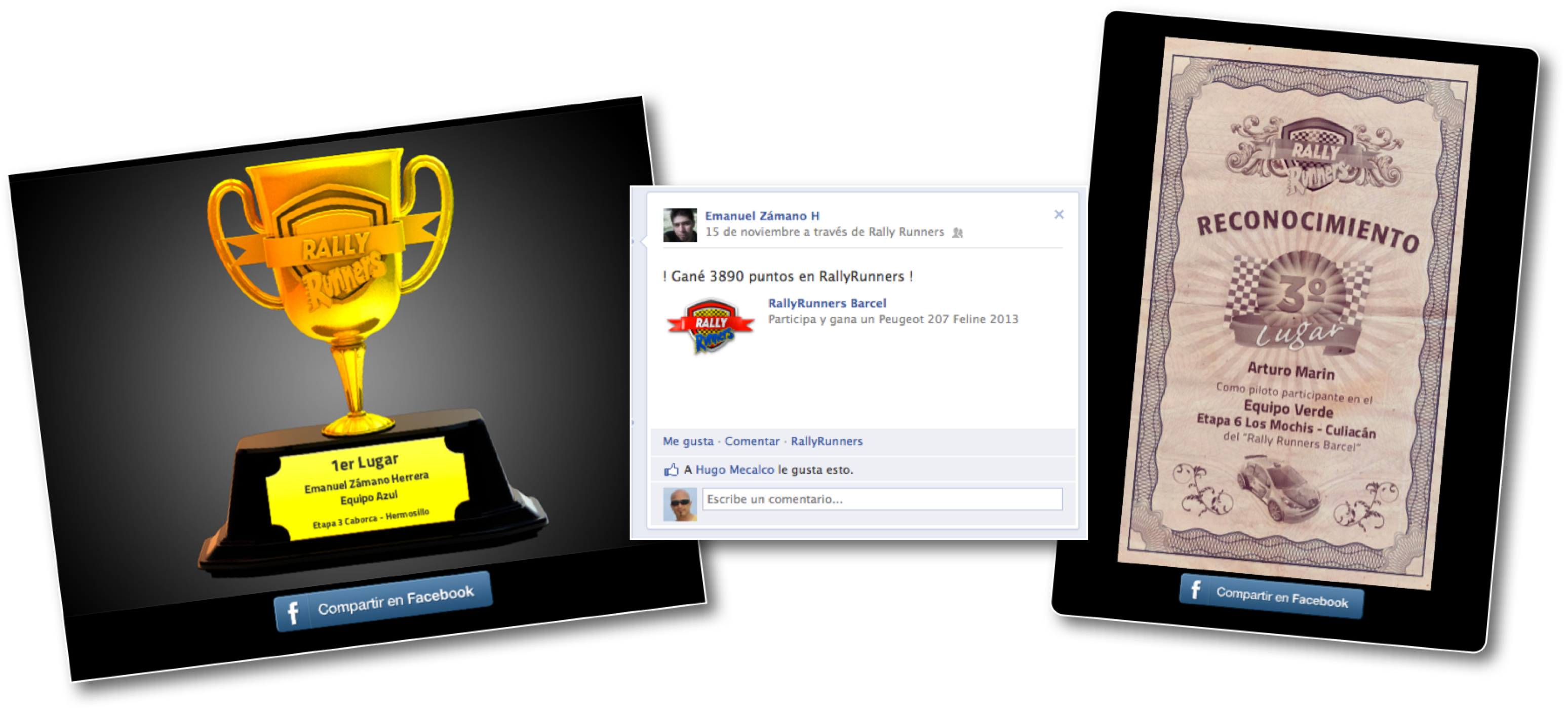 Además de los cuatro autos que se regalan en la promoción, decidimos incentivar a los jugadores ofreciendo reconocimientos virtuales mismos que llegan de forma automática para publicar en el muro de facebook de cada jugador.