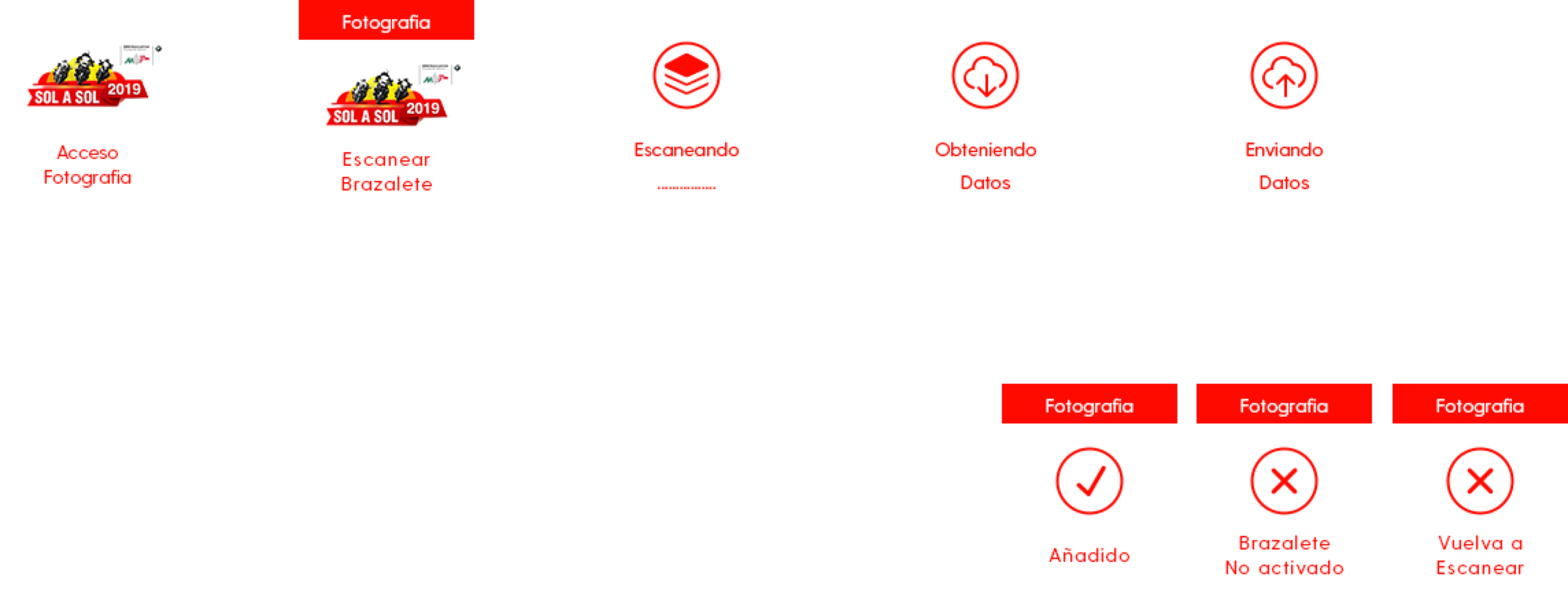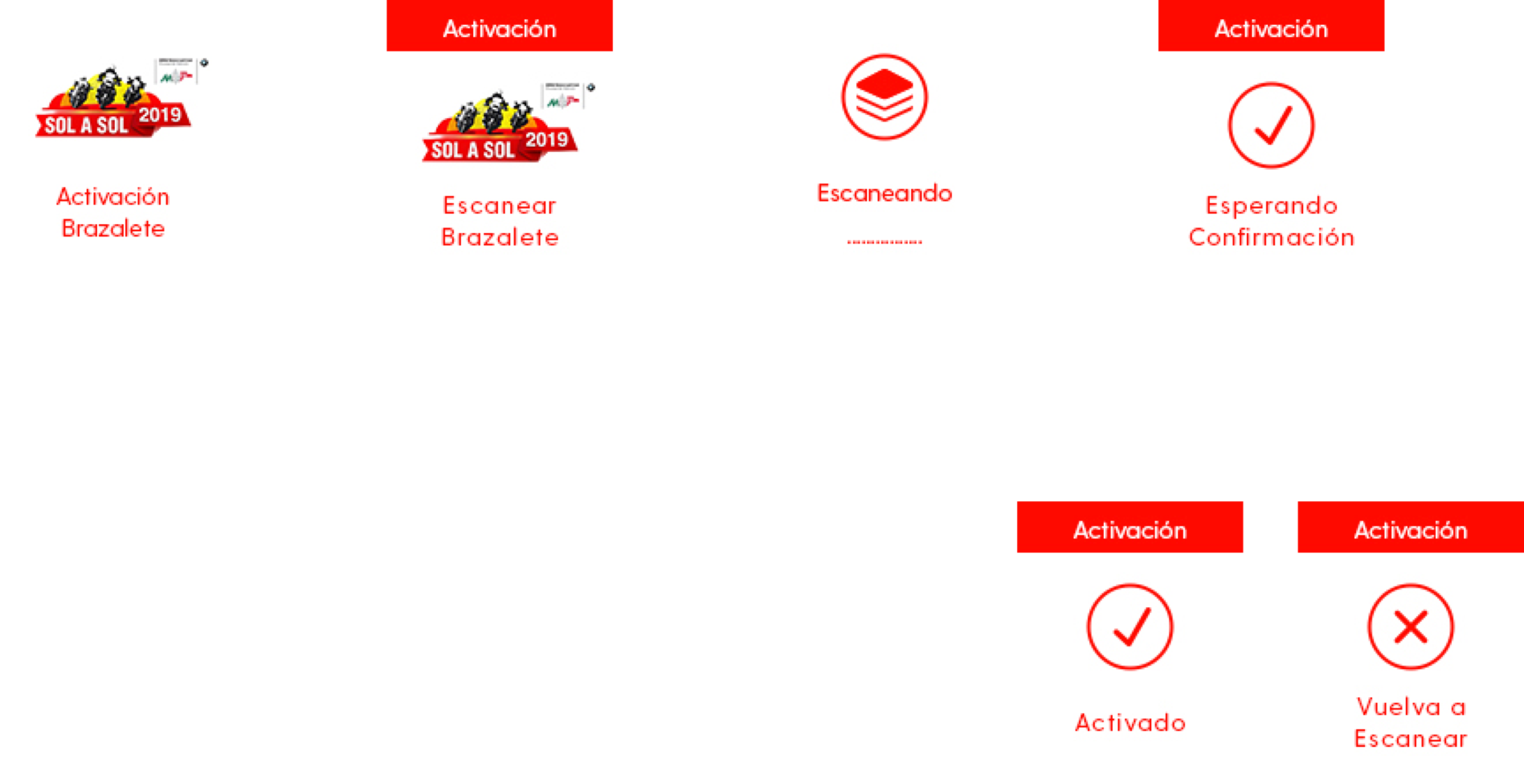 2. Activación de Brazaletes. Al llegar cada participante, el scanner confirma su identidad y pago. Una vez confirmado, el scanner activa el brazalete y lo registra en la base de datos.